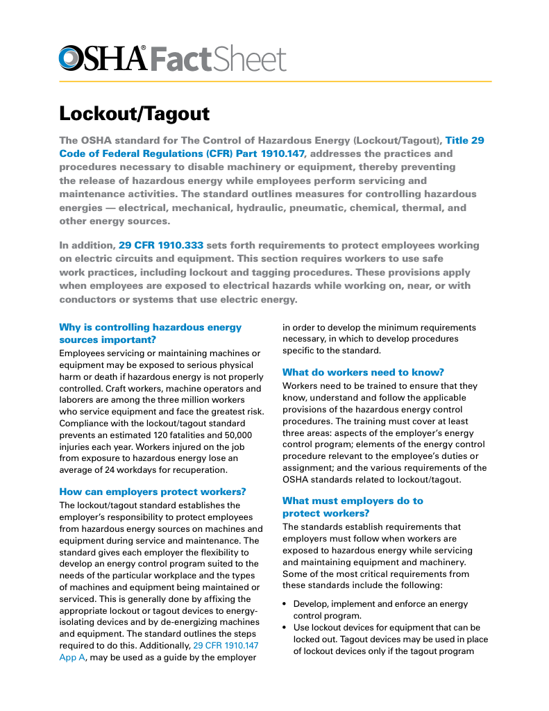Download Our OSHA FS3529 Fact Sheet – Lockout/Tagout Safety Procedures